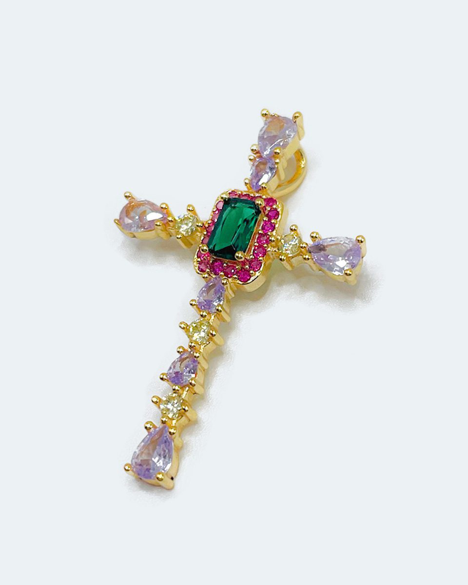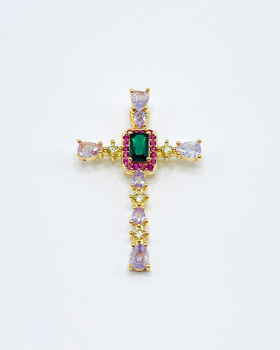 Colgante de cruz de plata chapada en oro con circonitas de colores