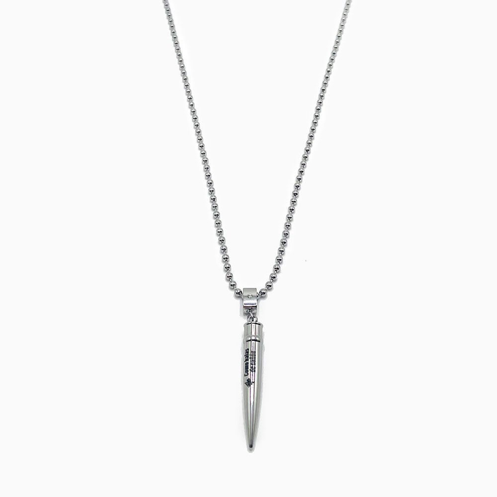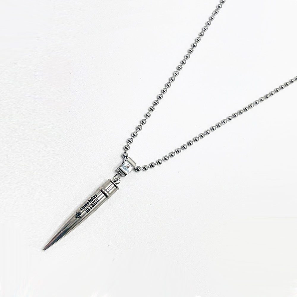 Collar de acero con colgante de bala grabada con «Como balas de cañón», como se conce popularmente su himno