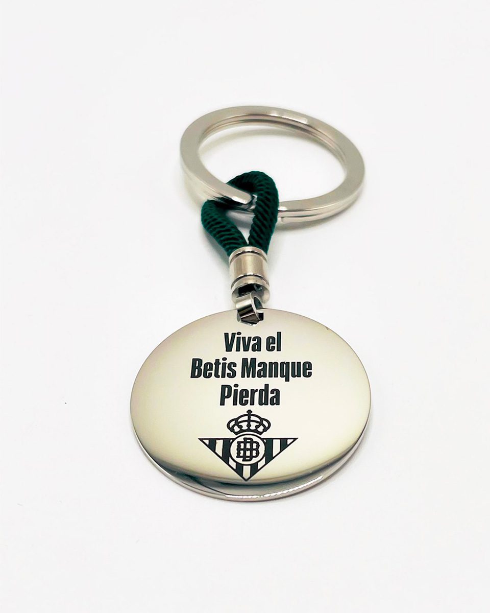 Llavero de acero del Betis grabado con el emblemático «Viva el Betis manque pierda»