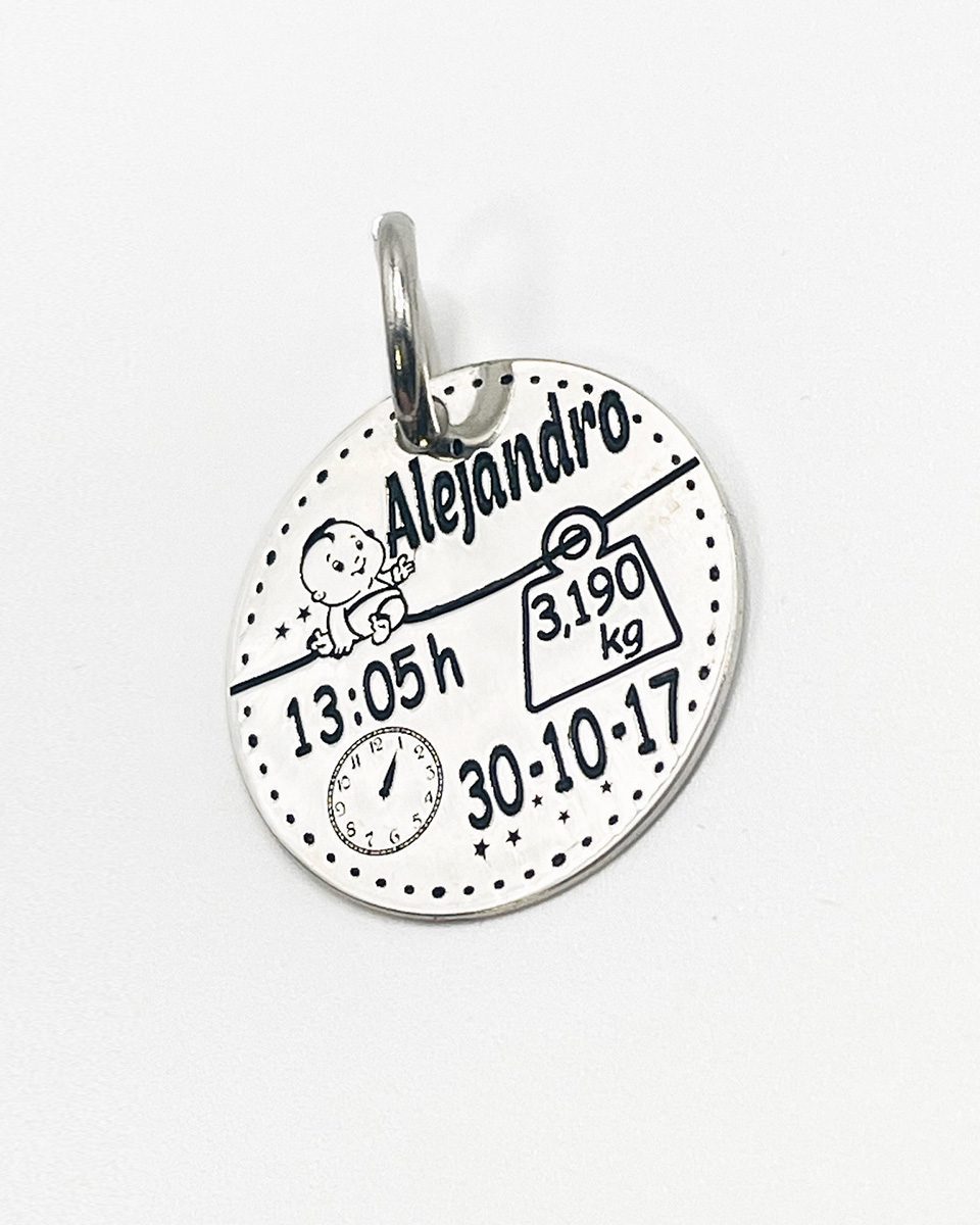 Medalla de plata personalizada de 20 mm con nombre y datos de nacimiento. . Por encargo, 10 dias aproximadamente.