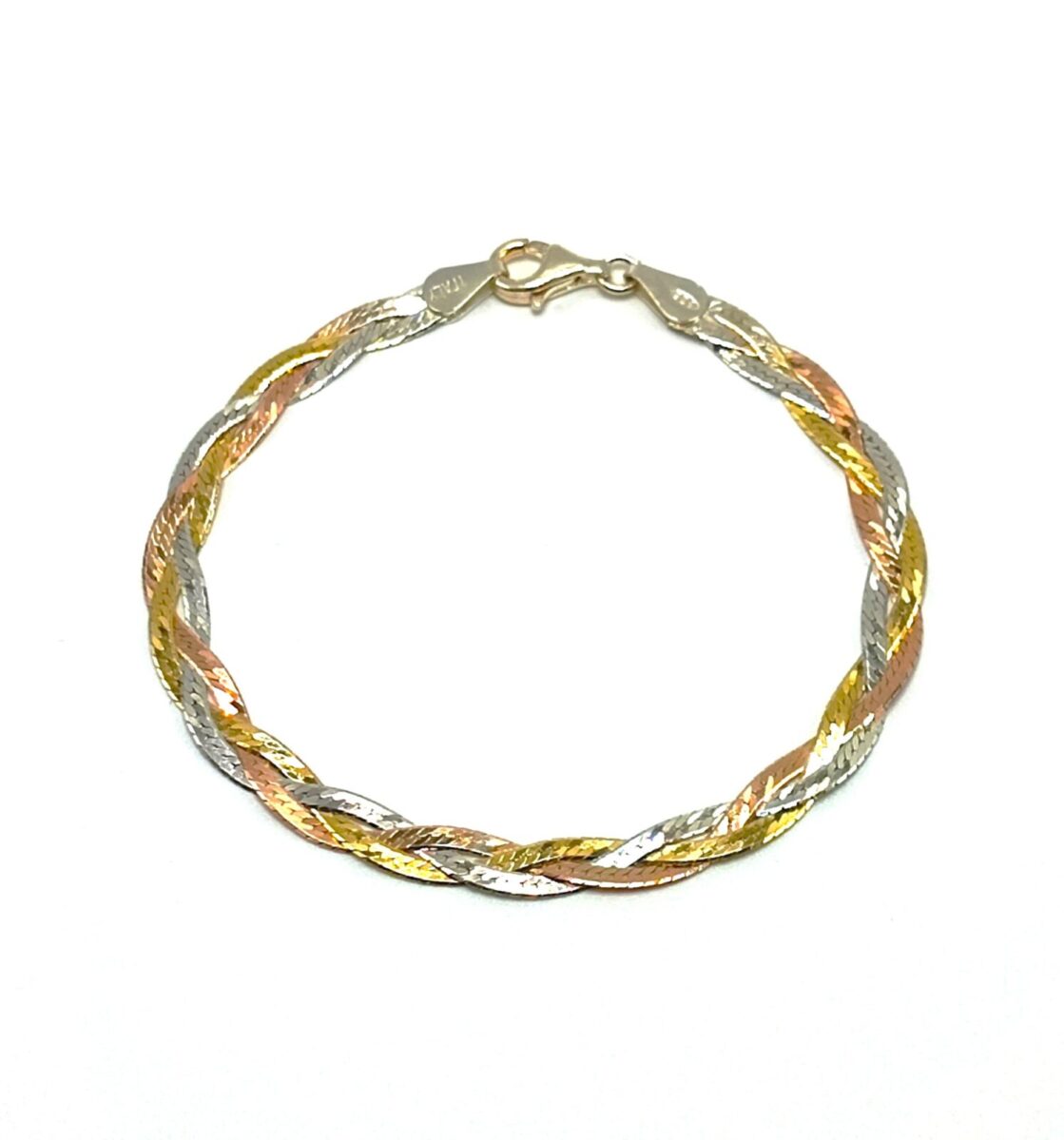 Pulsera trenzada tricolor de plata de ley, plata bañada en oro y plata rosada.